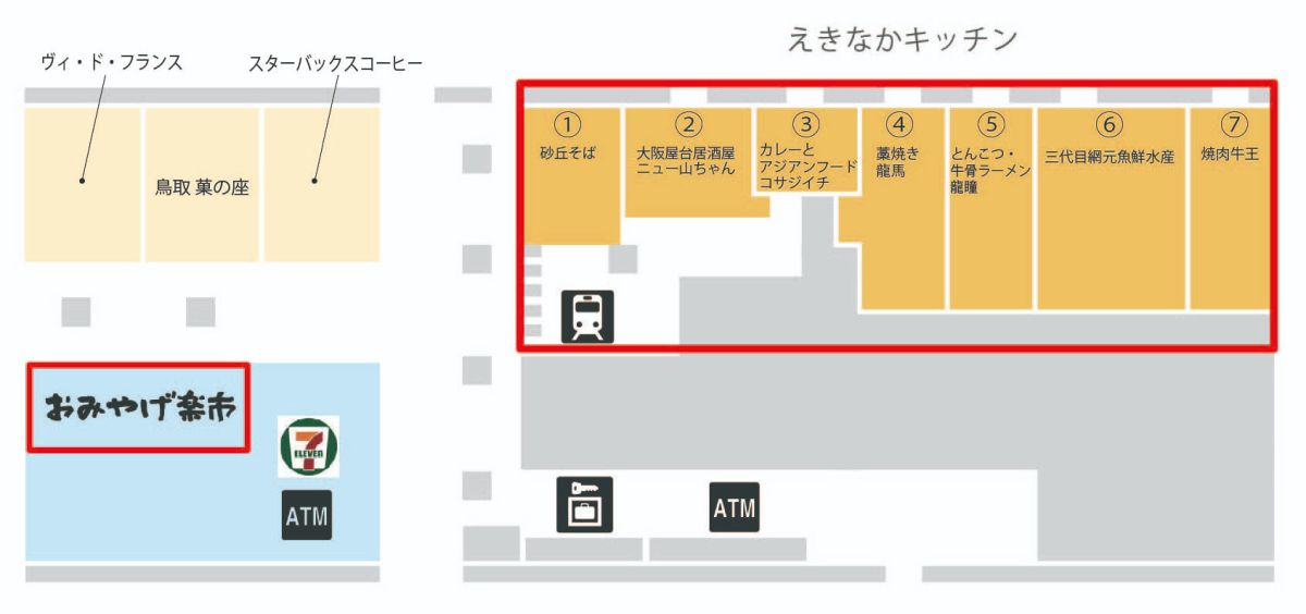 ・砂丘そば,大阪屋台居酒屋ニュー山ちゃんJR鳥取店,カレーとアジアンフード コサジイチ,藁焼き龍馬,とんこつ牛骨ラーメン 龍瞳,三代目網元魚鮮水産,焼肉牛王,