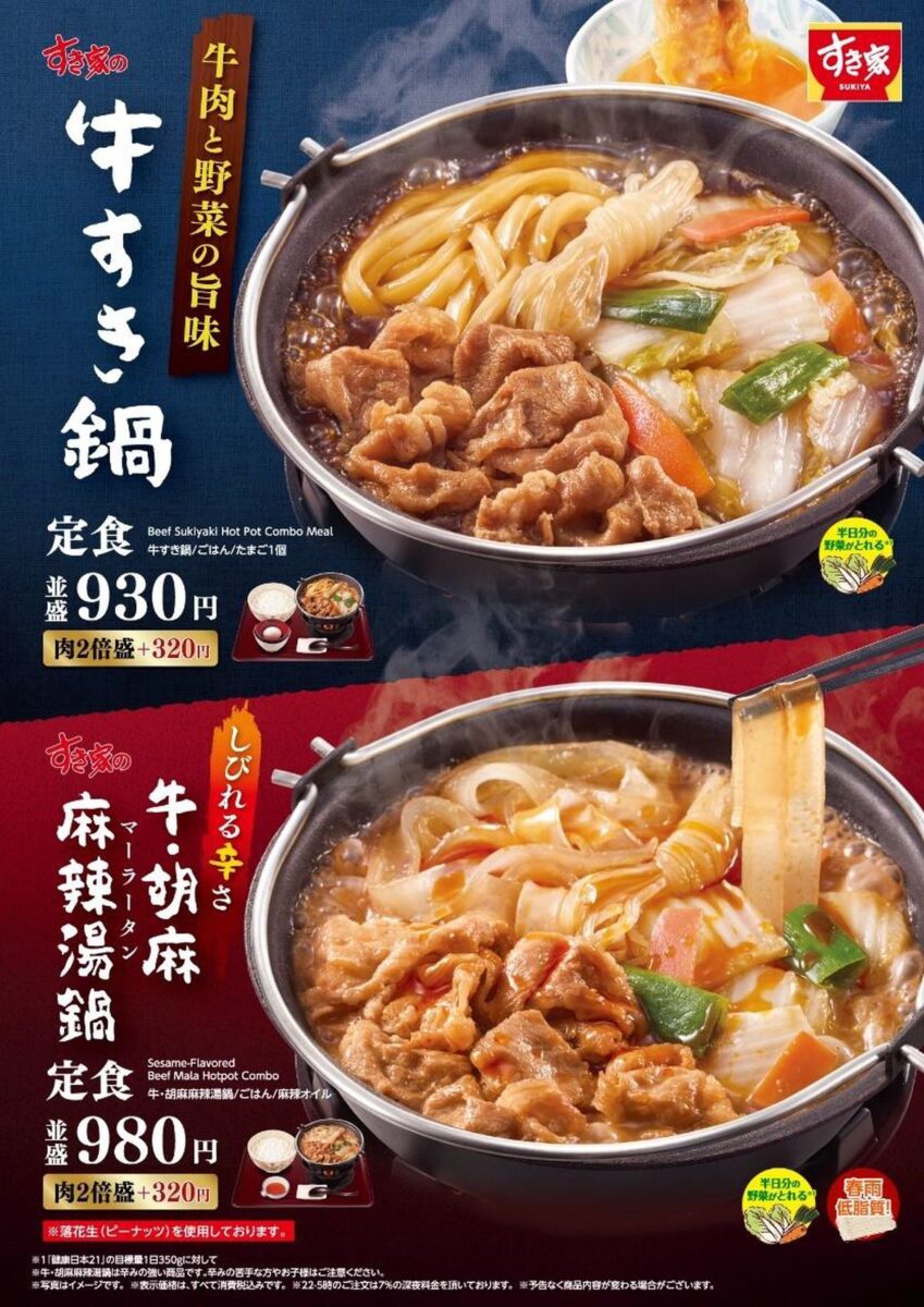 ・すき家「牛すき鍋定食」「牛・胡麻麻辣湯鍋定食」10/28発売開始,