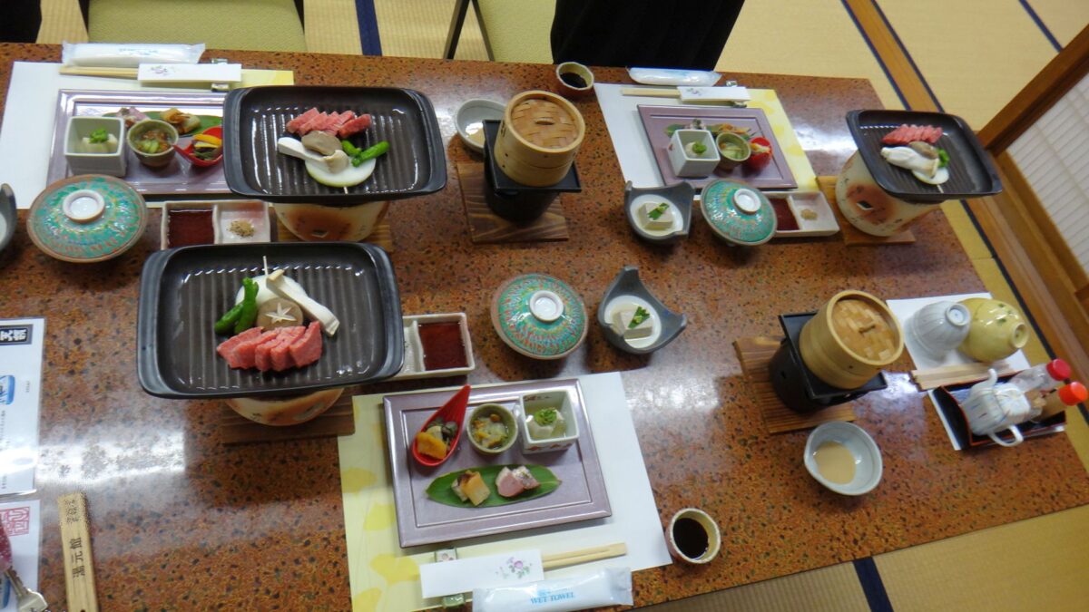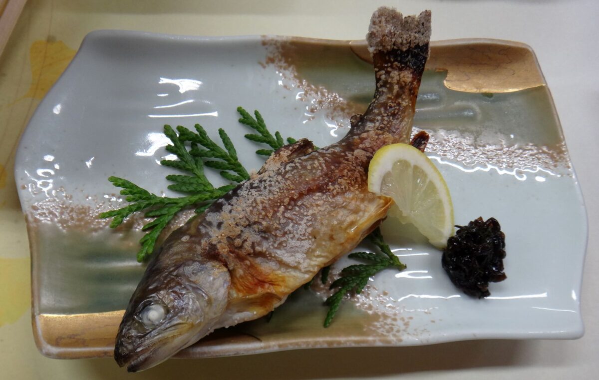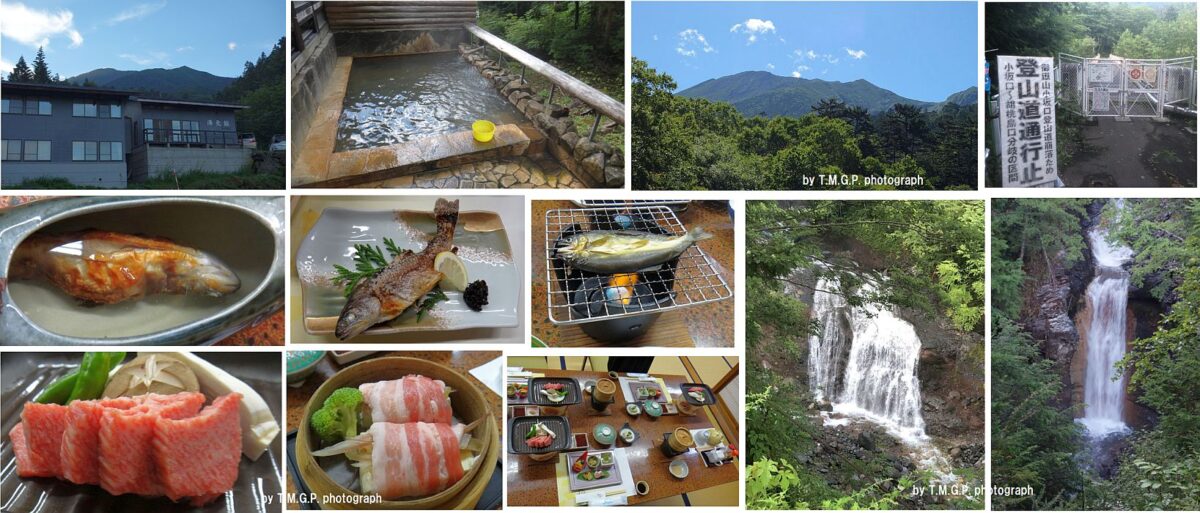 湯元館の夕食と朝食。岩魚(イワナ)の骨酒,飛騨牛,朴葉味噌,鮎の一夜干し。