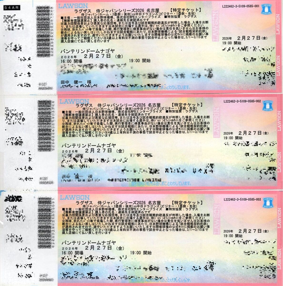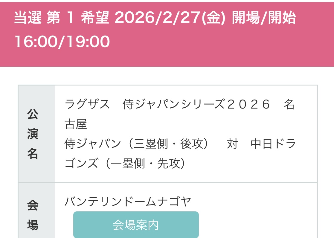 ・2026/01/09【先行抽選販売に当選】ラグザス侍ジャパンシリーズ2026年名古屋侍ジャパン対中日ドラゴンズ