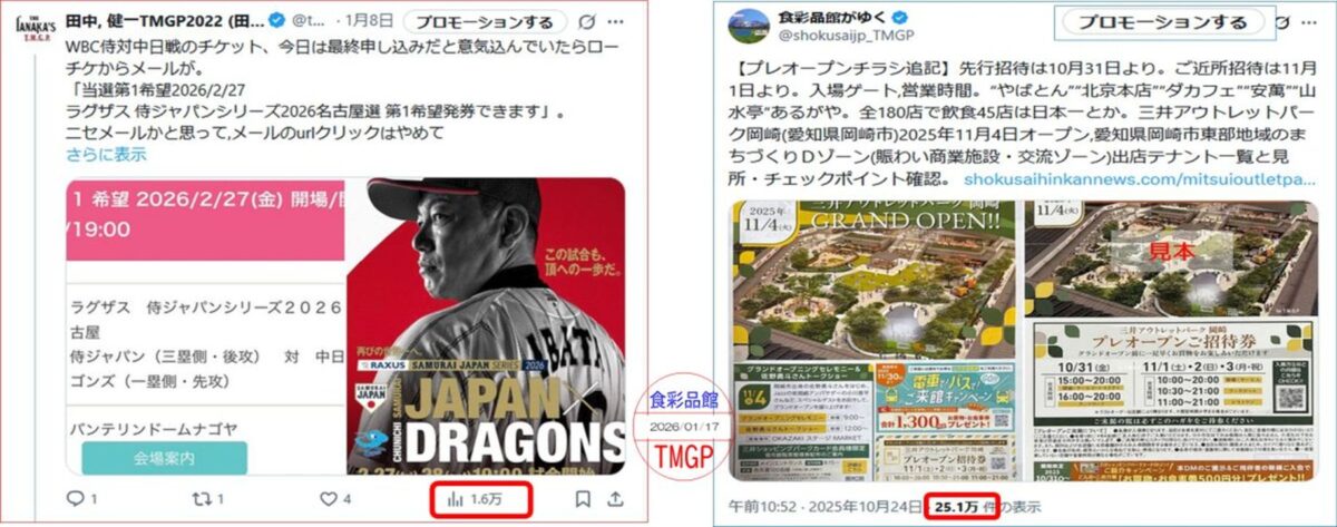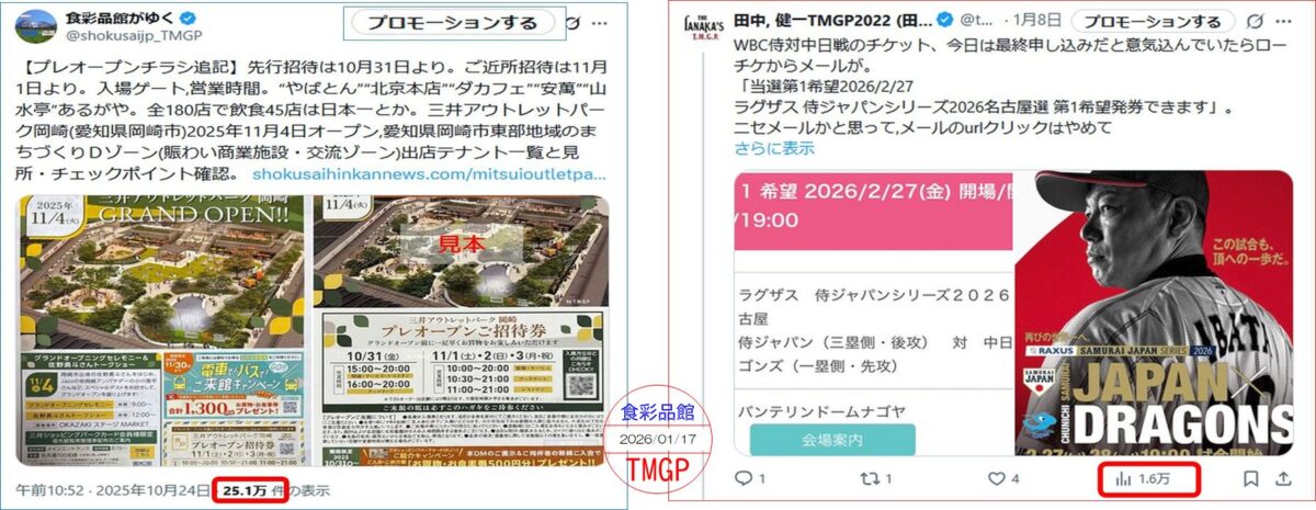 【X共同ポスト】一件のポストで最大インプレッション数25万(食彩品館がゆく)と1.6万(田中流通総合企画TMGP)