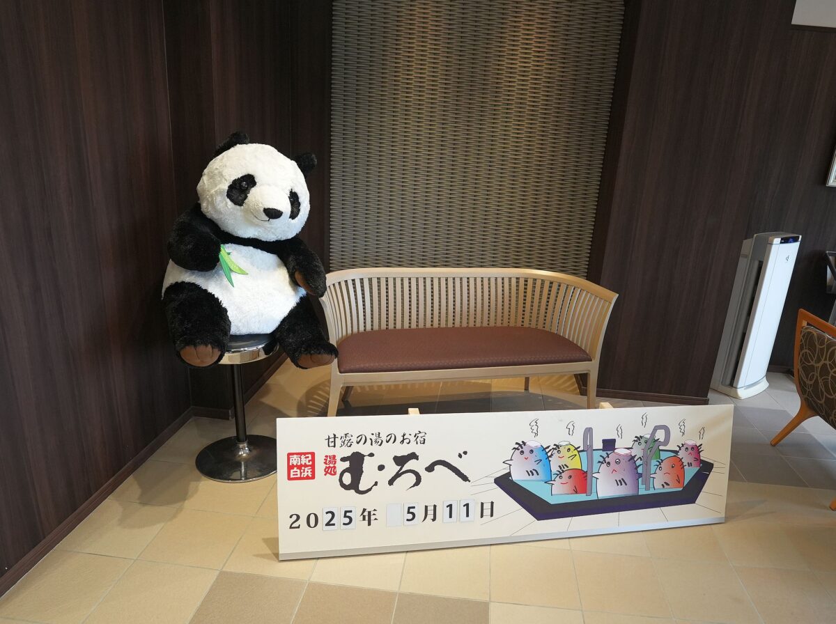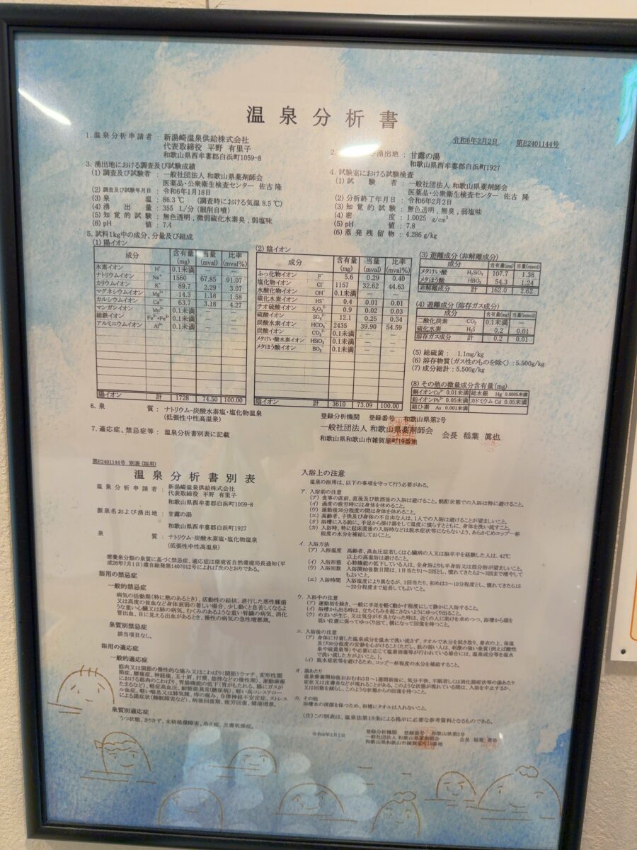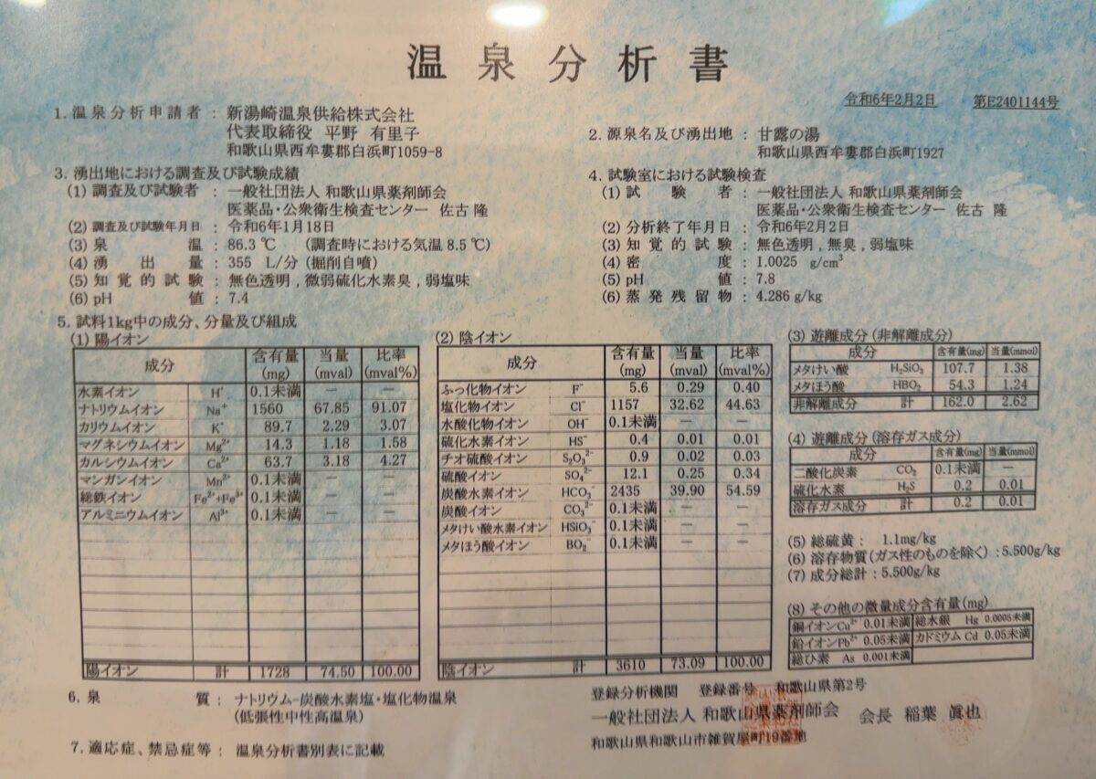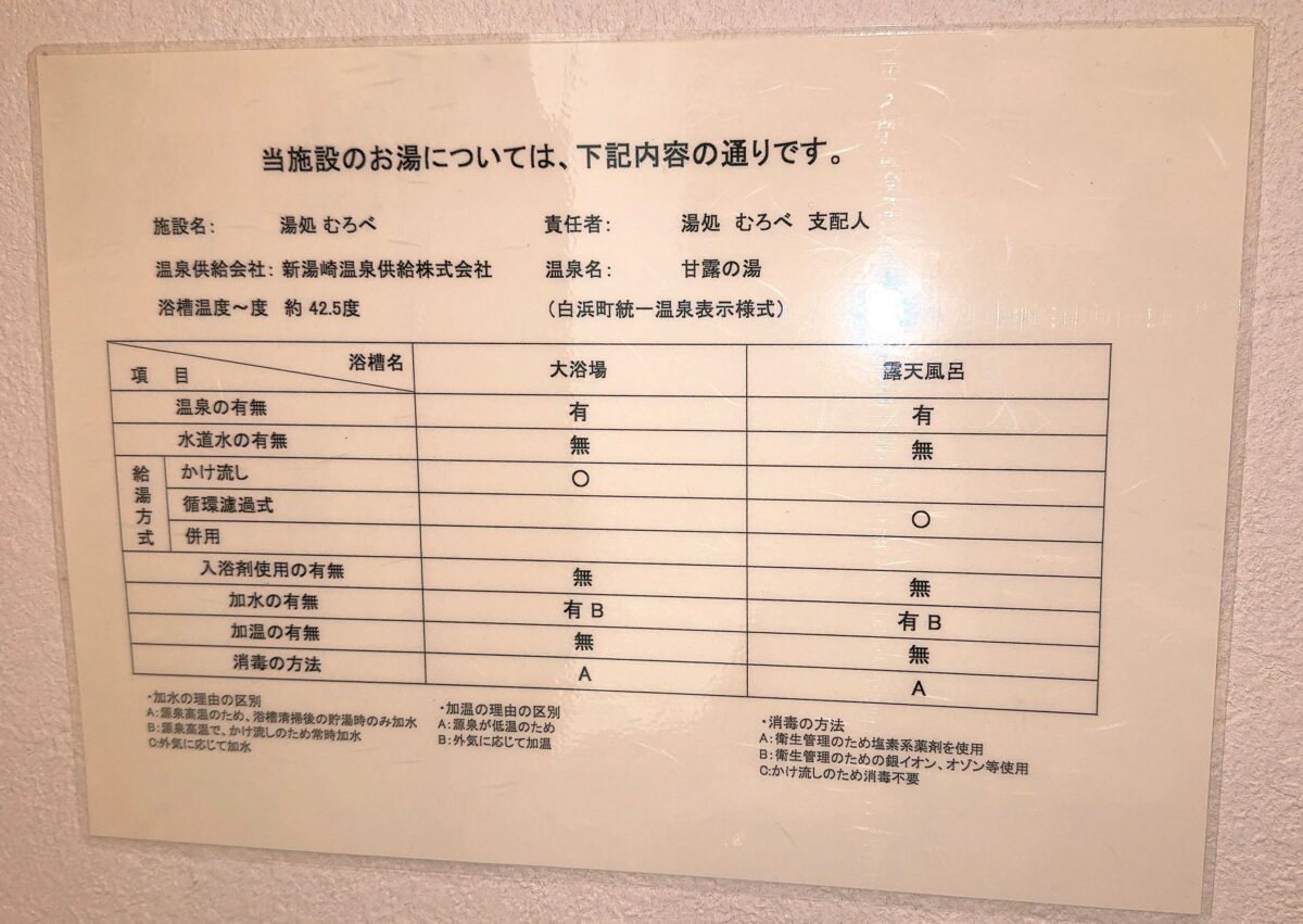 ・甘露の湯のお宿 湯処むろべ(和歌山県白浜町)貴重な「甘露の湯」源泉の宿。浴槽混雑の見える化,源泉かけ流しの内湯とそうではない露天風呂。