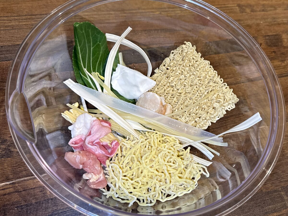・両津港だけの提供メニュー「両津港よくばり船乗りそば」と一風堂コラボの「佐渡濃厚海老ラーメン」。ホッコクアカエビとホンホッコクアカエビ。雪室熟成南蛮海老。岩のり,ながも,朱鷺色油揚げ。