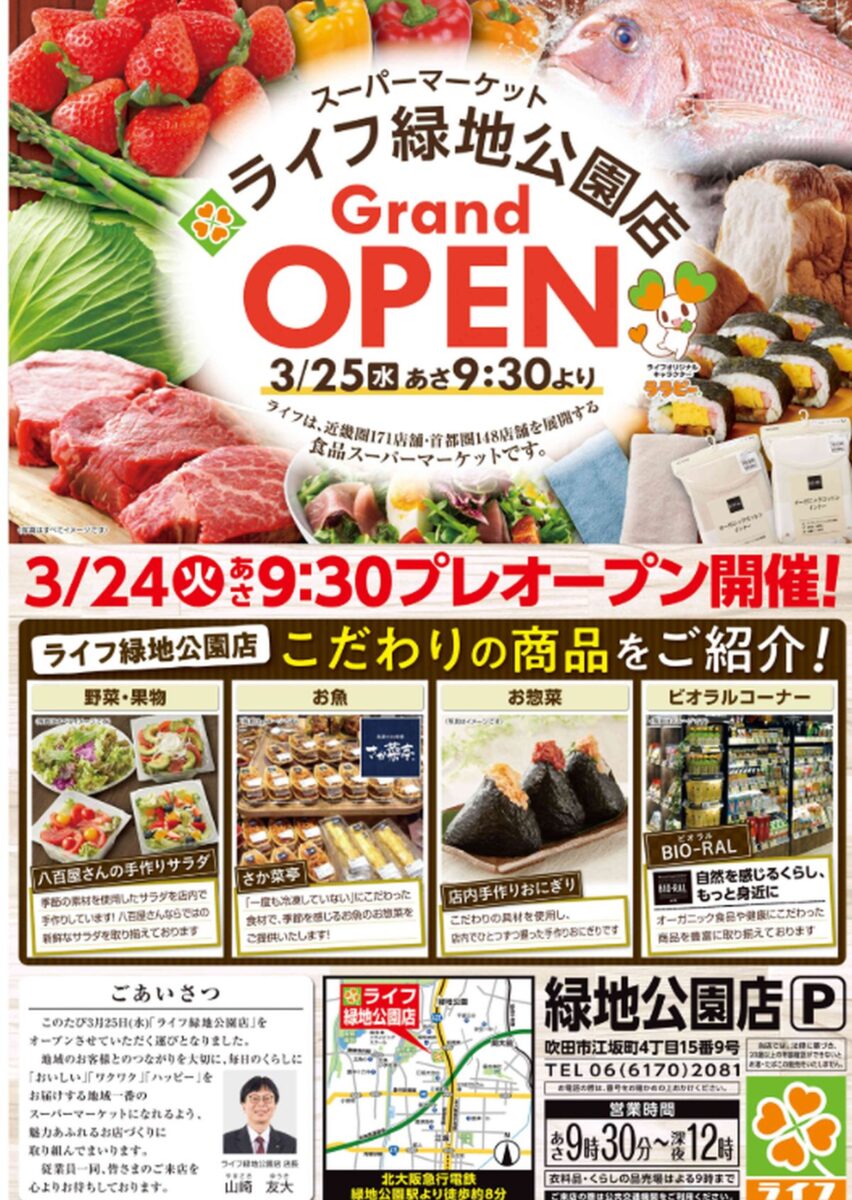 ライフ緑地公園店(大阪府吹田市)2026年3月24日プレオープン,3月25日グランドオープン,スーパーマーケット,