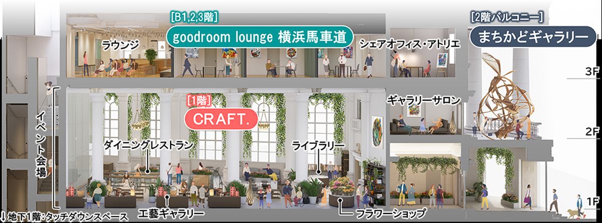 ・世界各地の工藝作品を集積させたギャラリーやライブラリーを備え、全国から選りすぐりのフード・ドリンクを提供するダイニングレストラン「CRAFT. Table」に加えて、フラワーショップ「CRAFT. Flora Ludique by Hanahiro」を設け、文化・芸術・観光を発信。