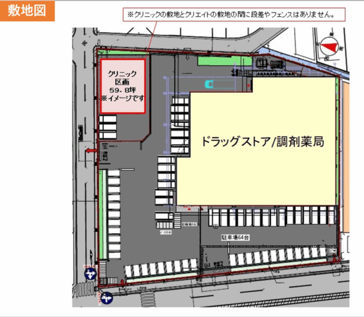 既存店クリエイトエスディー静岡高松店の敷地内にクリニックモールを併設する計画。