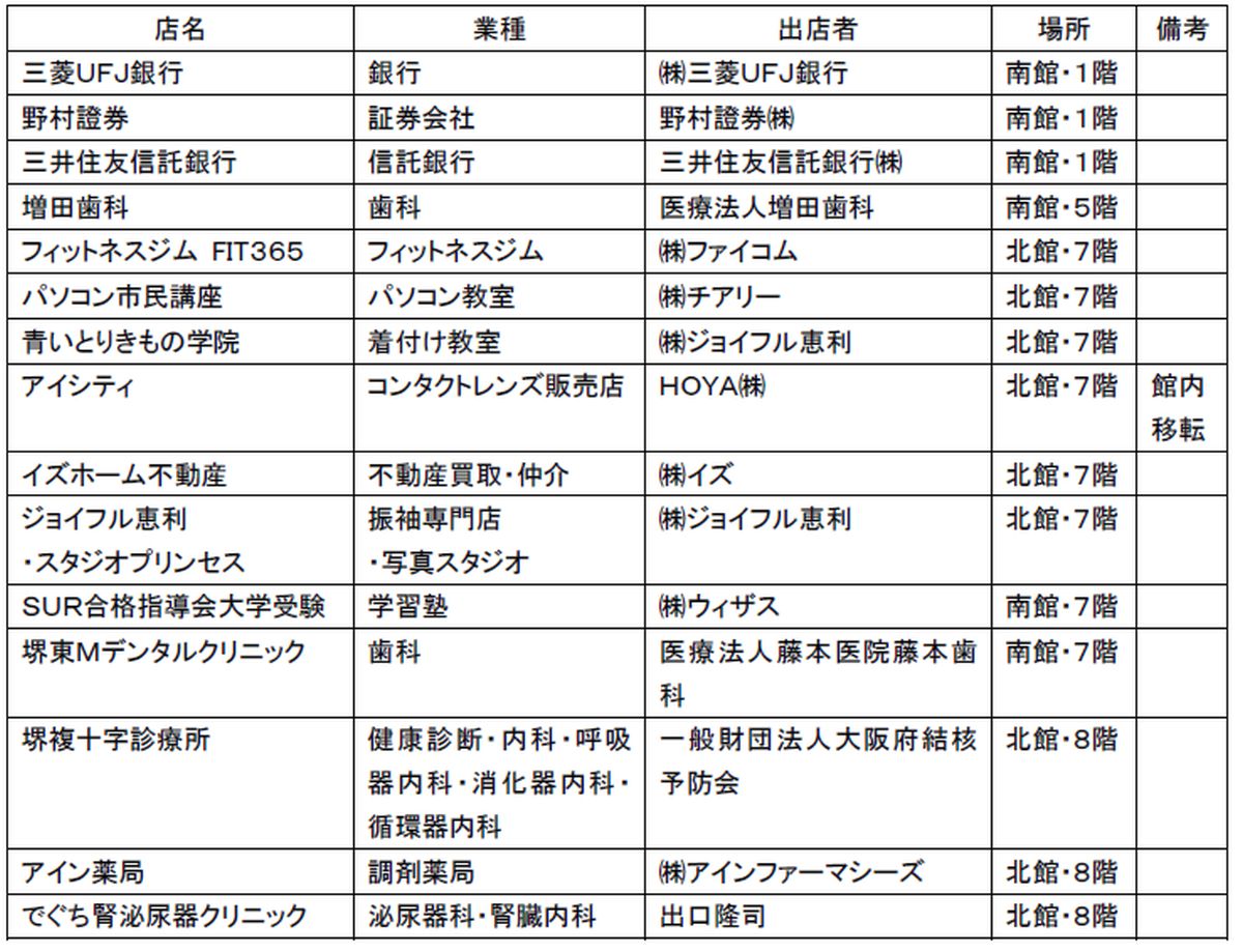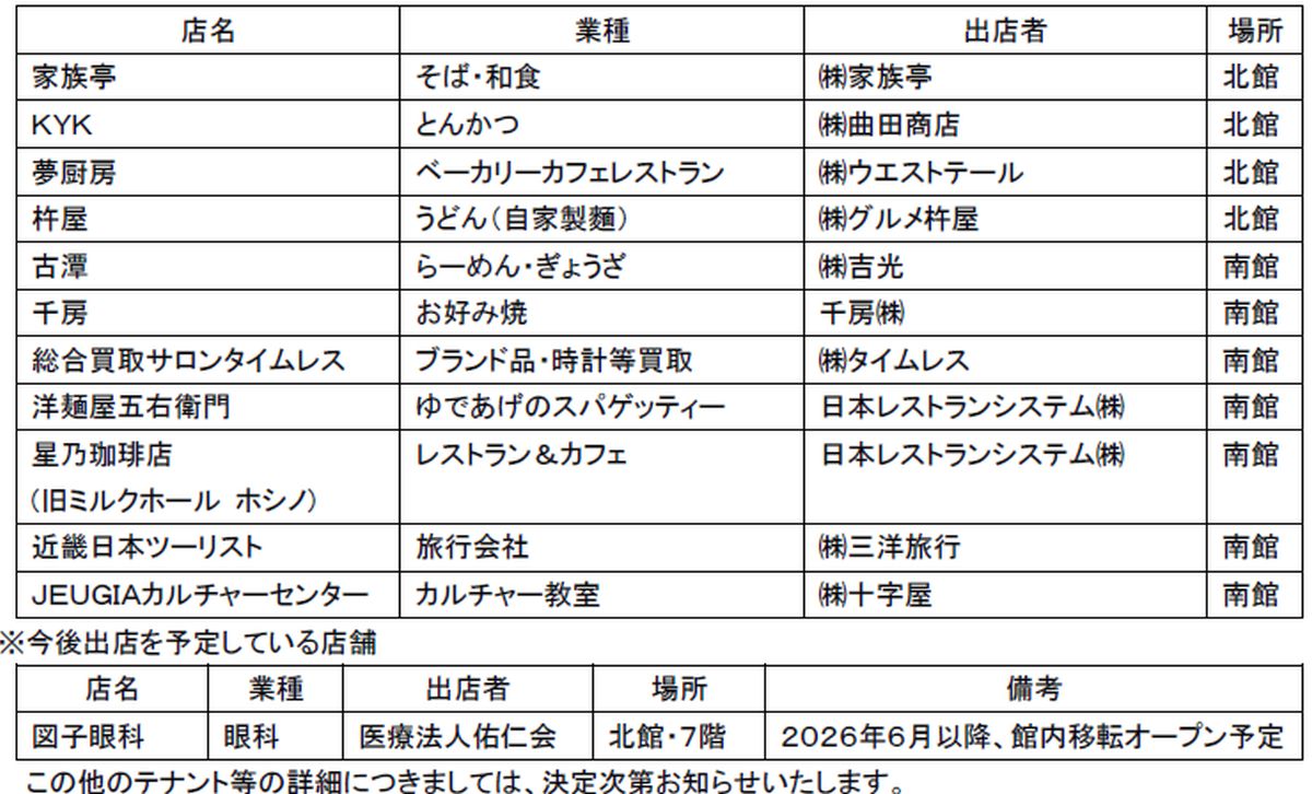 家族亭,KYK,夢厨房,杵屋,古澤,千房,総合買取サロンタイムレス,洋麺屋五右衛門,星野珈琲,近畿日本ツーリスト,JEUGIAカルチャーセンター