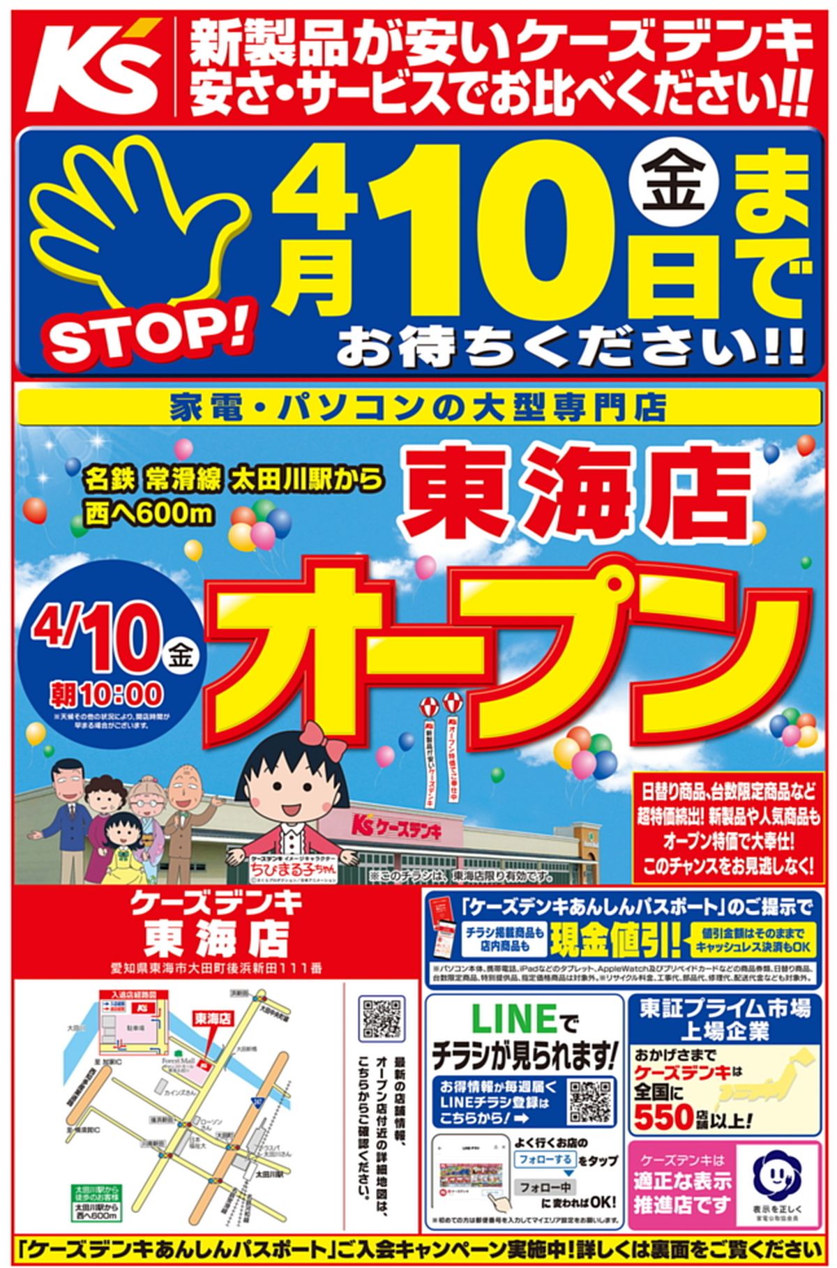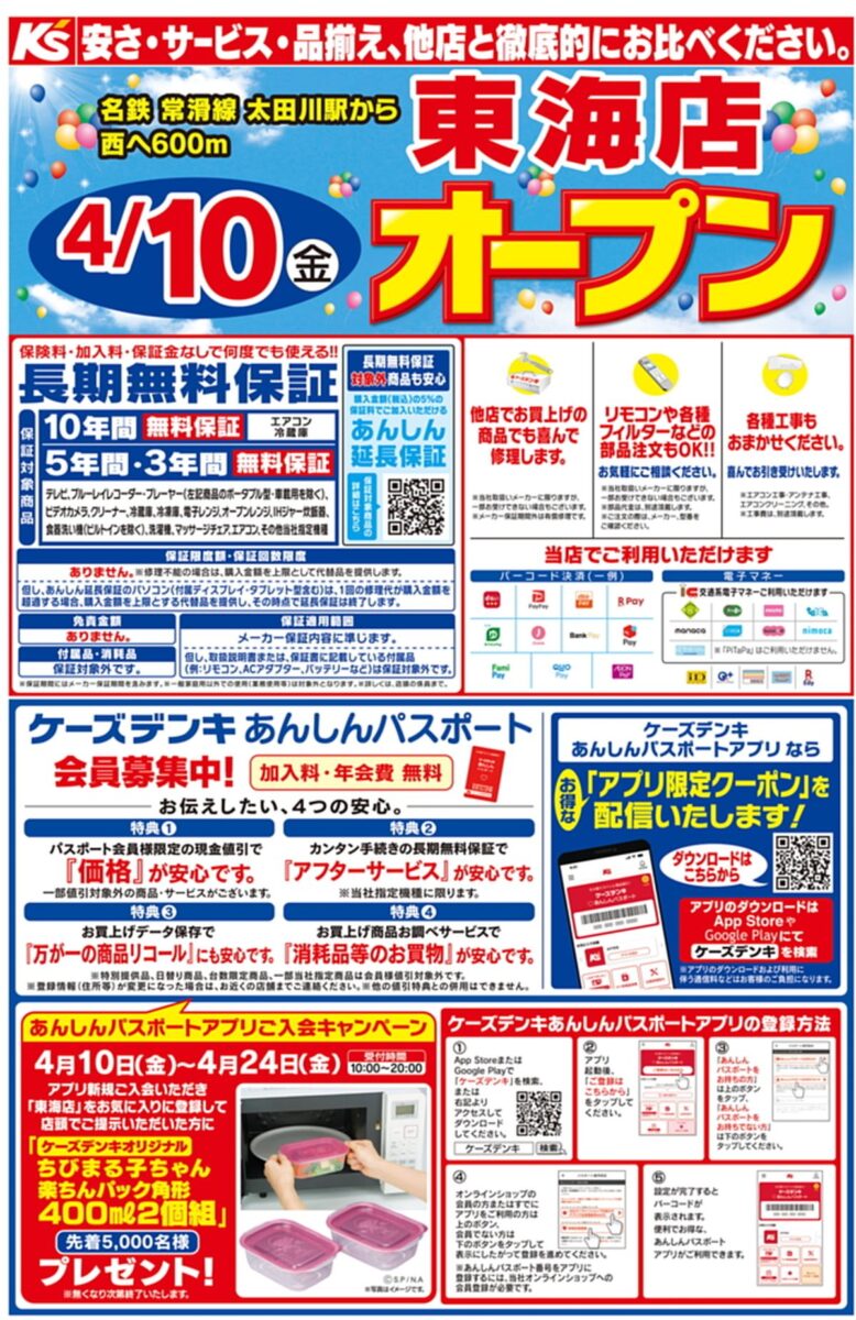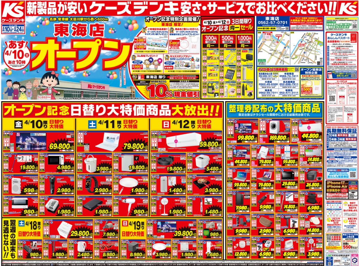 【オープンチラシ追記】ケーズデンキ東海店(愛知県東海市)2026年4月10日オープン,フォレストモール東海太田川店は4月16日グランドオープン(4月10日先行オープン), 2026 4/09 01新店改装情報 05東海地方 06家電・パソコン・撮影 2026年4月9日 URLをコピーしました! 目次・4/10ケーズデンキ東海店 店舗HP 愛知県東海市大田町後浜新田111番 ℡0562-57-0701 営業時間 10:00~20:00 ・フォレストモール東海太田川(愛知県東海市)2026年4月10日専門店10店オープン,4月16日全店オープン,エクボスタイル(フィールのみ4月16日オープン),ケーズデンキ東海店,ダイソー,スターバックススペシャリティ,サブウェイ,他,,サンドラッグは3月31日オープン済, ・4/10先行,4/16フォレストモール東海太田川 施設HP愛知県東海市大田町後浜新田111番 ・4/16エクボスタイル東海太田川店(フィール 共有: Facebook で共有 (新しいウィンドウで開きます) Facebook X で共有 (新しいウィンドウで開きます) X 関連 01新店改装情報 05東海地方 06家電・パソコン・撮影 2026年4月10日オープン 4月10日先行オープン ケーズデンキ東海店 フォレストモール東海太田川店は4月16日グランドオープン 愛知県東海市 この記事が気に入ったら いいね または フォローしてね! Follow @shokusaijp_TMGP Follow Me シェア歓迎です URLをコピーしました! ★2026年4月9日の告知ページ。商業施設オープンと旅と食の話題 エクボスタイル東海太田川店(フィール,愛知県東海市)2026年4月16日オープン,フォレストモール東海太田川は4月10先行オープン, この記事を書いた人 食彩品館news 食品調達部門統括、店舗運営部門統括、商品戦略本部長を歴任し、現在に至る(定年退職)。調理師、食肉技師、有機栽培行程管理士教育受講、法学士。 関連記事 フォレストモール東海太田川(愛知県東海市)2026年4月10日専門店10店オープン,4月16日全店オープン,エクボスタイル(フィールのみ4月16日オープン),ケーズデンキ東海店,ダイソー,スターバックススペシャリティ,サブウェイ,他,,サンドラッグは3月31日オープン済, 2026年4月9日 ★2026年4月9日の告知ページ。商業施設オープンと旅と食の話題 2026年4月9日 ★2026年4月8日の告知ページ。商業施設オープンと旅と食の話題 2026年4月8日 ステーキのあさくま尾張旭店(愛知県尾張旭市)2026年4月11日オープン,匠肉祭 2026年4月8日 ★2026年4月7日の告知ページ。商業施設オープンと旅と食の話題 2026年4月7日 マリメッコ展2026年7月開幕,京都文化博物館(京都)・東京都庭園美術館(東京)・ひろしま美術館(広島)、 北九州、富山、名古屋、長崎、ほか巡回予定 2026年4月7日 ★2026年4月6日の告知ページ。商業施設オープンと旅と食の話題 2026年4月6日 ぴよりんvillage(ヴィレッジ,JR名古屋駅)2026年6月オープン,名古屋駅中央コンコース,ドトールコーヒーショップアスティ岐阜店「ドトールコーヒーぴよりん」,パティシエ「ひより」, 2026年4月6日