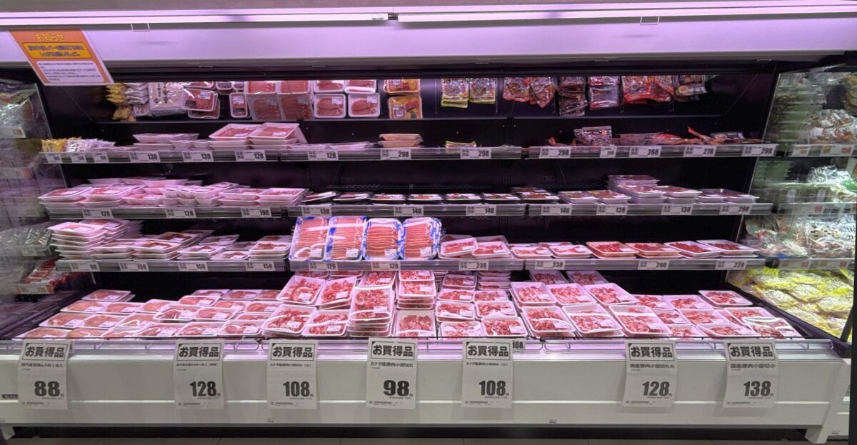 期待していた「生鮮」のうち、精肉がボチボチある(売場画像参照)がアウトパック商品。総菜は取り売り商品ばかりで価格も高め。青果も平台はなく、定番商品が並ぶ。