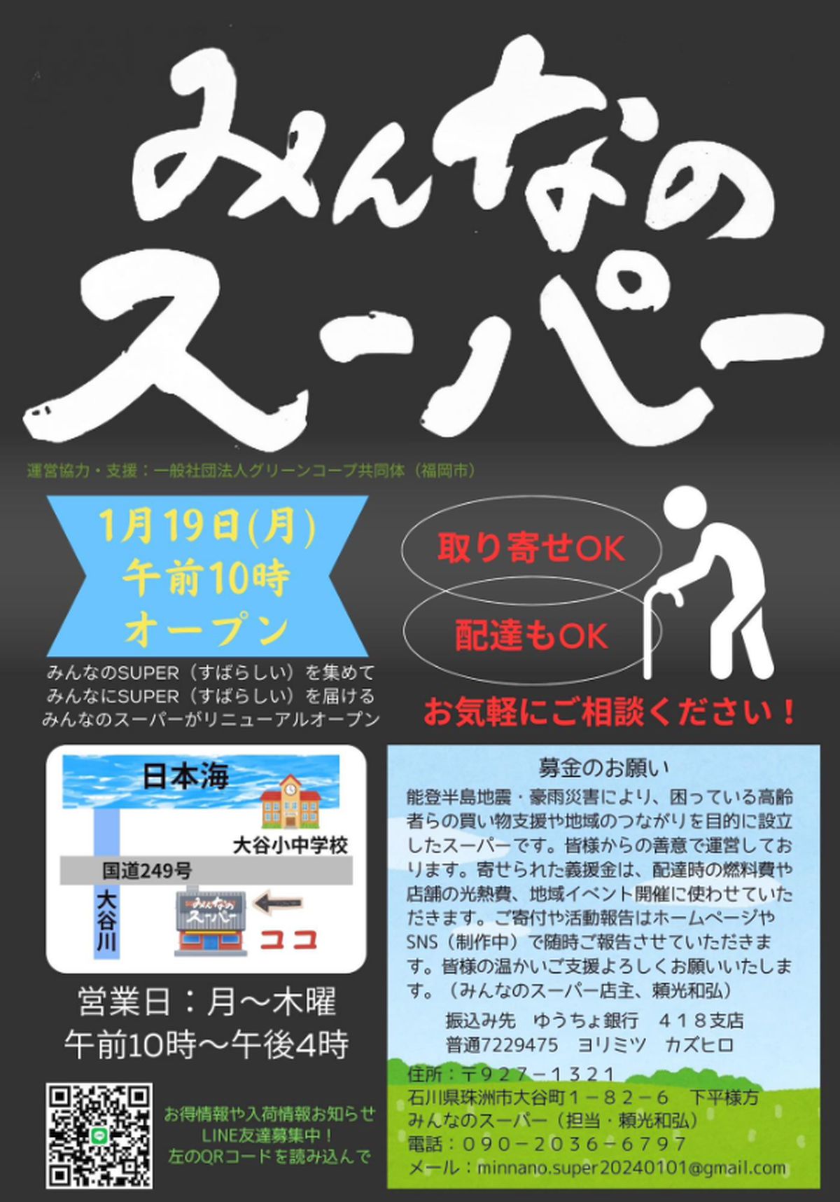 グリーンコープが能登半島地震で被災した石川県珠洲市大谷地区にて、地域の生活支援を目的とした食品スーパー「みんなのスーパー」の開業・運営支援