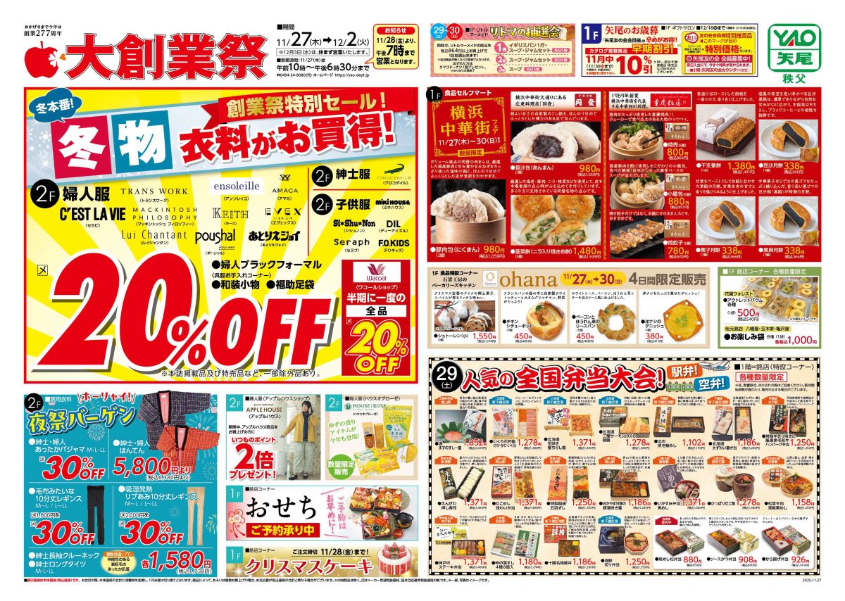 八尾百貨店(埼玉県秩父市)2025年11月28日リニューアルオープン,ヤマダデンキファミリーショップヤオ秩父店, 2025 11/28 Uncategorized 2025年11月28日 URLをコピーしました! 目次・11/28改装八尾百貨店 施設HP ・11/28ヤマダデンキファミリーショップヤオ秩父店 店舗HP 埼玉県秩父市上町1丁目5番9号℡0494-24-8080営業時間 10:00~18:30 矢尾百貨店フロアガイドダウンロード 矢尾百貨店様11月27日号ダウンロード ◇出店地付近の地図 新店・改装情報記事地域別一覧(画像クリック)↓ 共有: Facebook で共有するにはクリックしてください (新しいウィンドウで開きます) Facebook クリックして X で共有 (新しいウィンドウで開きます) X 関連 Uncategorized この記事が気に入ったら いいね または フォローしてね! Follow @shokusaijp_TMGP Follow Me シェア歓迎です URLをコピーしました! クリエイトS・D瀬戸西追分店(愛知県瀬戸市)2026年5月20日予定で大規模小売店舗立地届出,ドラッグストア,クリニック,珈琲, ★2025年11月28日の告知ページ。商業施設オープンと旅と食の話題 この記事を書いた人 食彩品館news 食品調達部門統括、店舗運営部門統括、商品戦略本部長を歴任し、現在に至る(定年退職)。調理師、食肉技師、有機栽培行程管理士教育受講、法学士。 関連記事 BLiX茅ヶ崎(神奈川県茅ヶ崎市)2025年11月27日オープン,マルエツBLiX茅ヶ崎店,デコホーム,Food_warehouse,マツモトキヨシ,不二家,餃子の王将,喜多方ラーメン坂内,ファミリーマート, 2025年11月27日 ヤオコー船橋薬円台店(千葉県船橋市)2026年5月30日オープン予定で大規模小売店舗立地届出,スーパーマーケット, 2025年11月22日 スーパーセンタートライアル山武成東店(千葉県山武市)2026年5月20日オープン予定で大規模小売店舗立地届出,ディスカウントスーパー, 2025年11月16日 カネスエ田県店(愛知県小牧市)2026年5月3日オープン予定で大規模小売店舗立地届出,スーパーマーケット, 2025年11月15日 クリエイトSD豊田堤本町店(愛知県豊田市)2026年4月30日オープン予定で大規模小売店舗立地届出,ドラッグストア, 2025年11月15日 平和堂高岡早川店(仮称,富山県高岡市)2026年10月1日オープン予定で大規模小売店舗立地届出,スーパーマーケット, 2025年11月14日 ドン・キホーテ高山店(岐阜県高山市)2025年10月28日オープン,さるぼぼ風ドンペン,ひだっち,温泉むすめ,高山匠美コラボ, 2025年10月28日 道の駅るもい(北海道留萌市),モンベルアウトドアヴィレッジるもい,2026年4月21日オープン予定で大規模小売店舗立地届出,留萌市,モンベル,留萌観光協会,ちゃいもる, 2025年10月26日